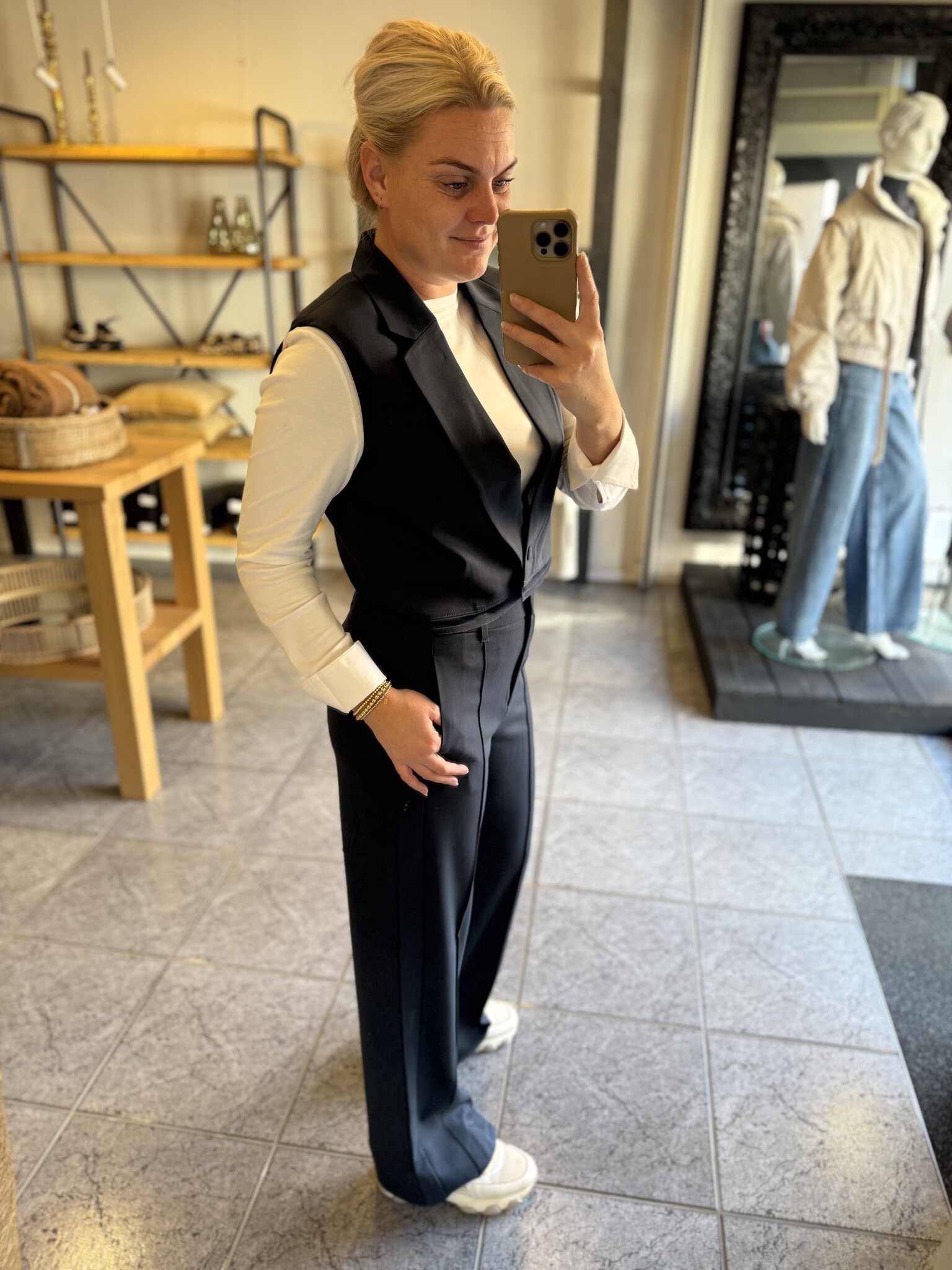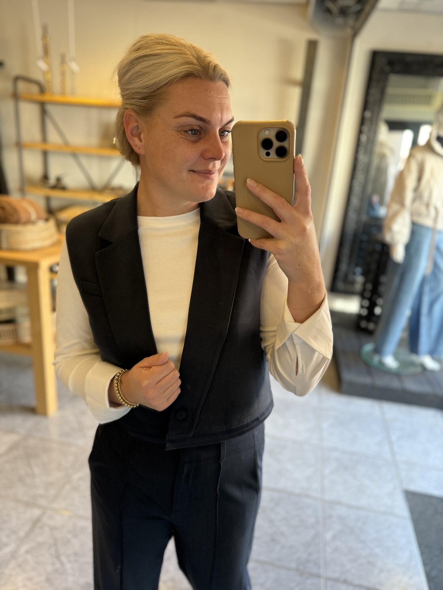 Deze eigentijdse mouwloze blazer is vervaardigd uit een zachte, geweven stof en heeft een cropped pasvorm. De dubbele laag en de klassieke reverskraag geven het item een verfijnde uitstraling. Voorzien van een beklede knoopsluiting en een sierborstzakje.
