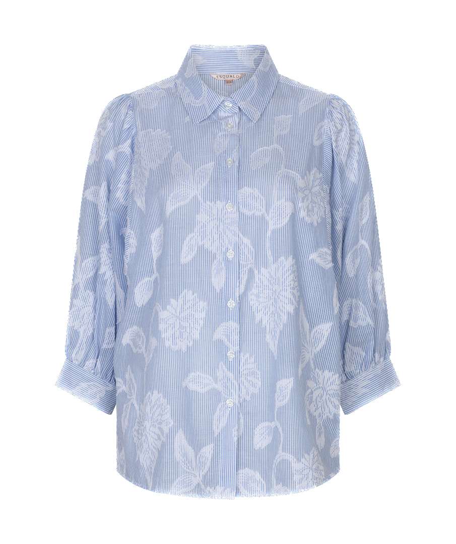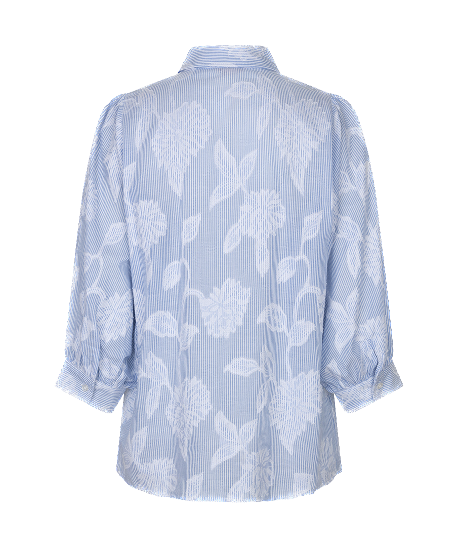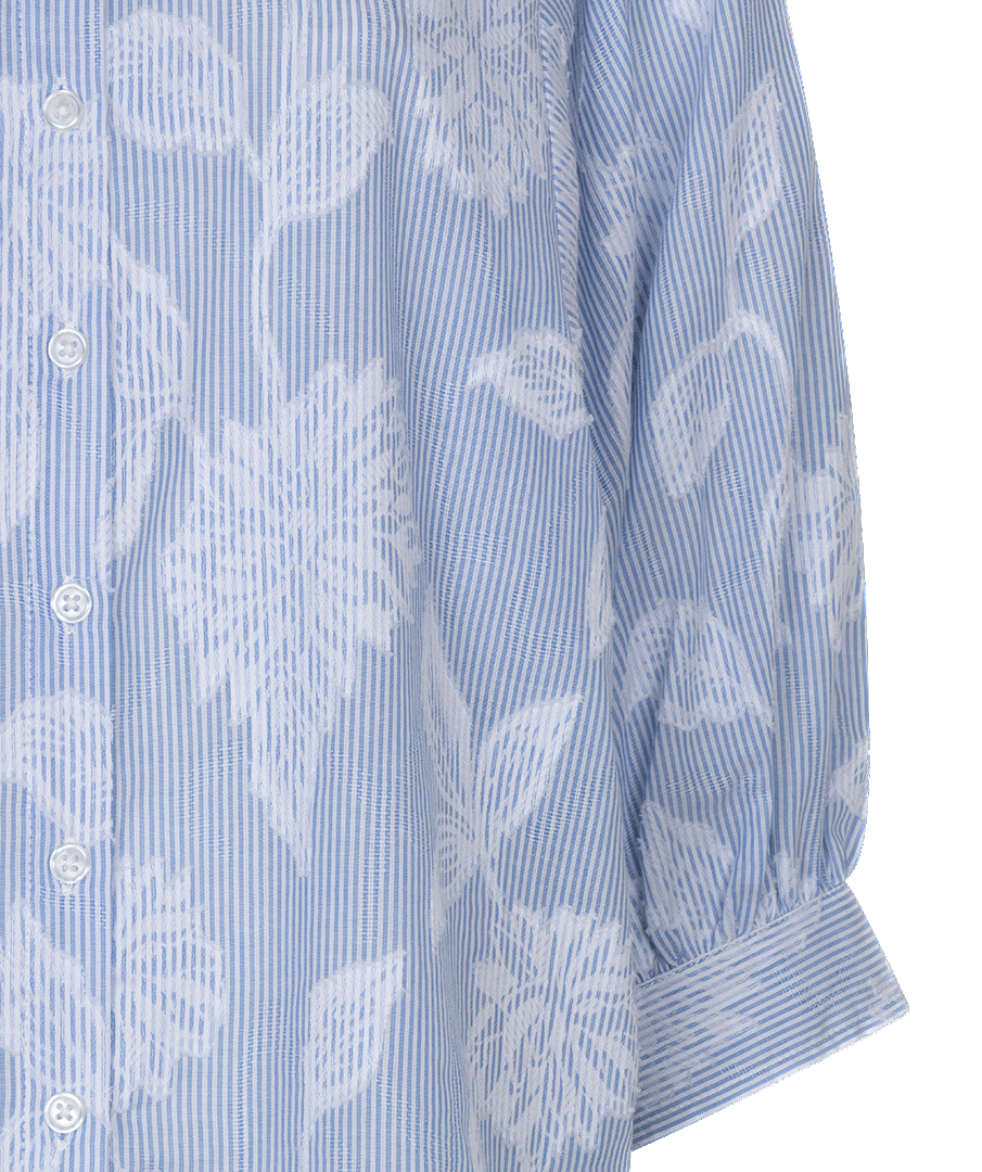 Elegante blouse in een verfijnde gestreepte flower jacquard stof, die zorgt voor een subtiel en luxe effect. Het model is voorzien van een stijlvolle reverskraag en speelse ballonmouwen, wat de blouse een vrouwelijke en modieuze uitstraling geeft. Gemaakt van 100% katoen, waardoor de stof ademend en comfortabel aanvoelt. Perfect om zowel chic als casual te combineren.