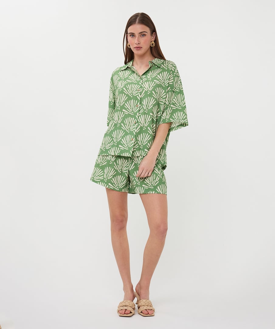 Deze blouse met korte mouwen in een levendige Tropical print geeft je outfit direct een frisse en zomerse uitstraling. De lichte stof van 80% rayon en 20% nylon voelt soepel en luchtig aan, ideaal voor warme dagen.