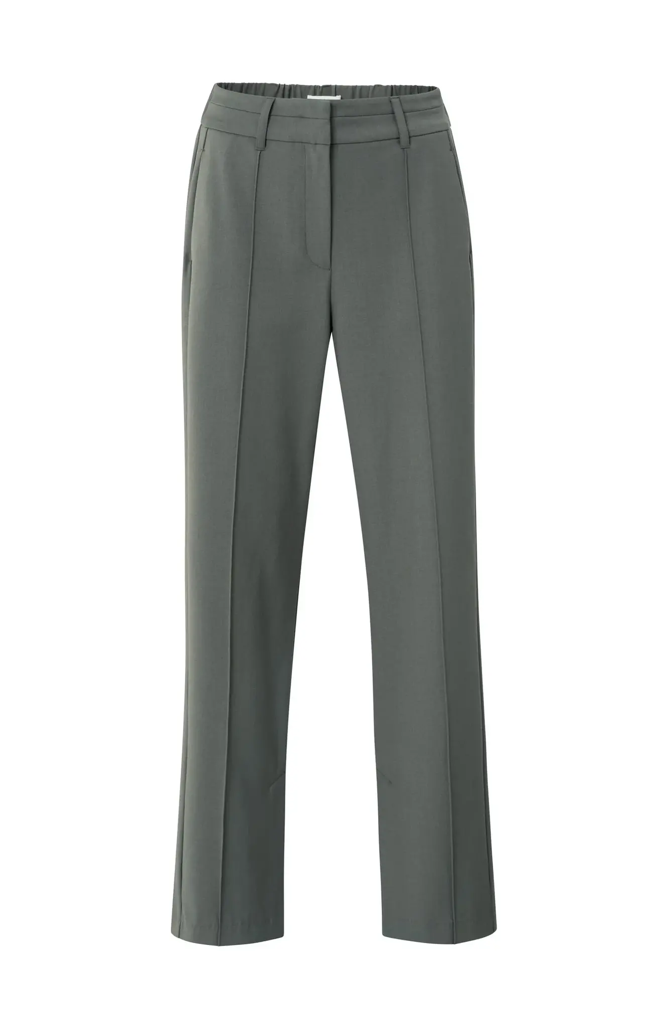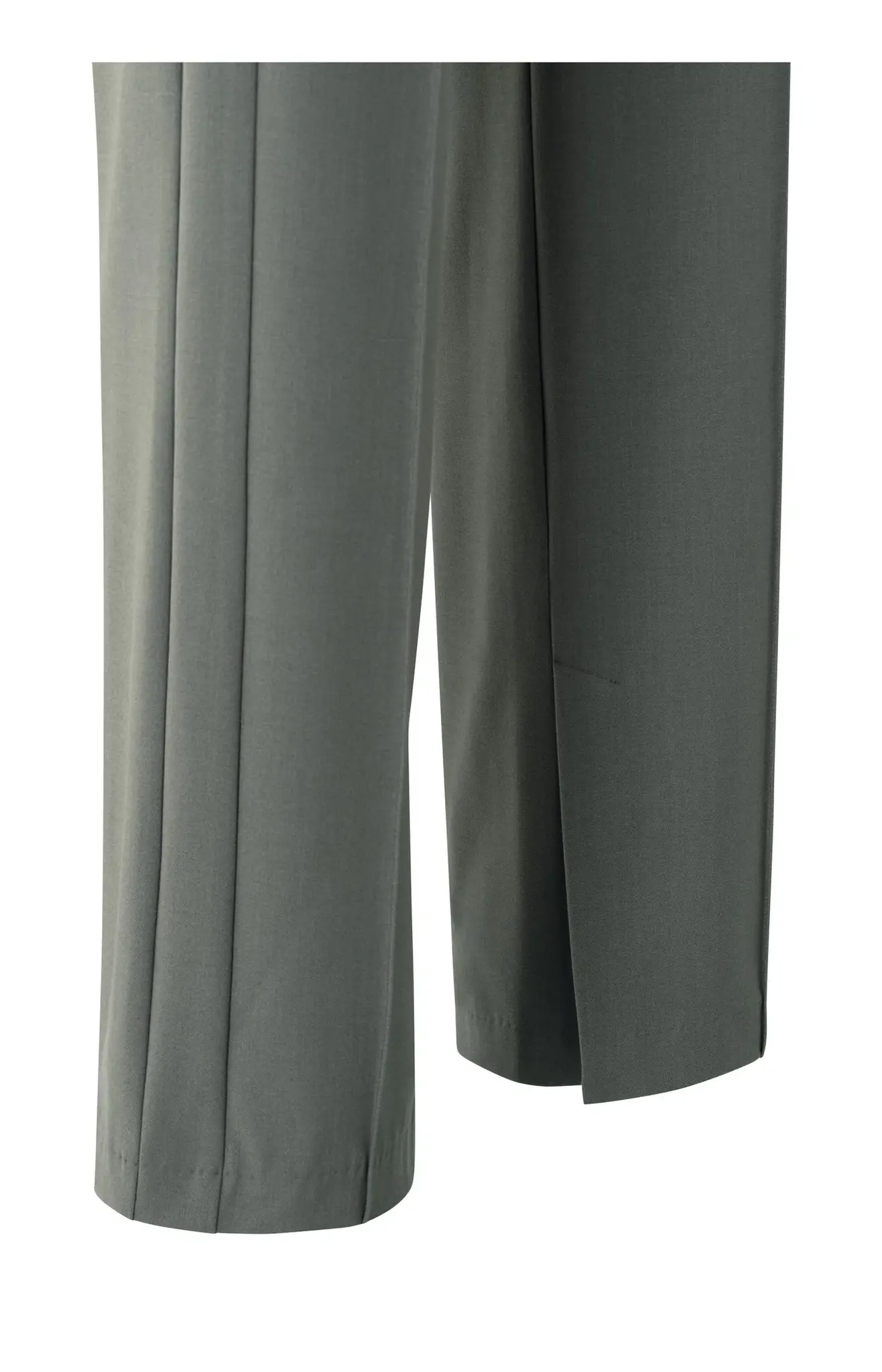 Deze zachte, geweven broek heeft een flatterende hoge taille, rechte pijpen en een comfortabele elastische tailleband aan de achterzijde. De sierplooien aan de voorzijde geven een elegante touch, terwijl de split aan de zoom zorgt voor een modern detail. Perfect te combineren met zowel een blouse als een casual top.