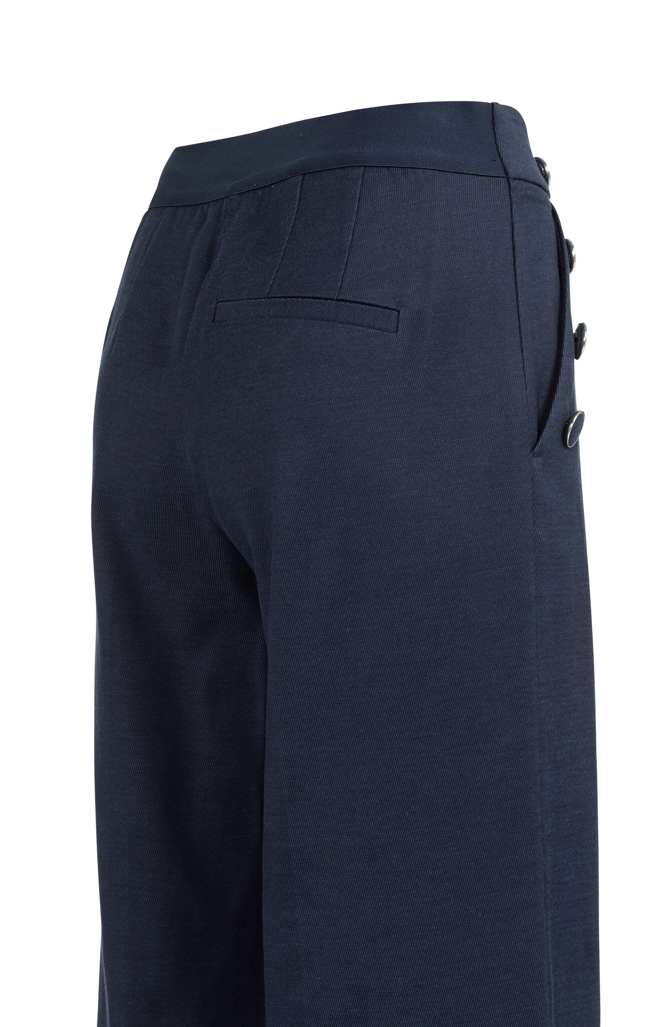 Deze stijlvolle broek met hoge taille is gemaakt van een zachte, soepelvallende stof en heeft een losse pasvorm. Het model heeft wijde pijpen en is afgewerkt met sierlijke knopen langs de zijkant voor een verfijnde touch.