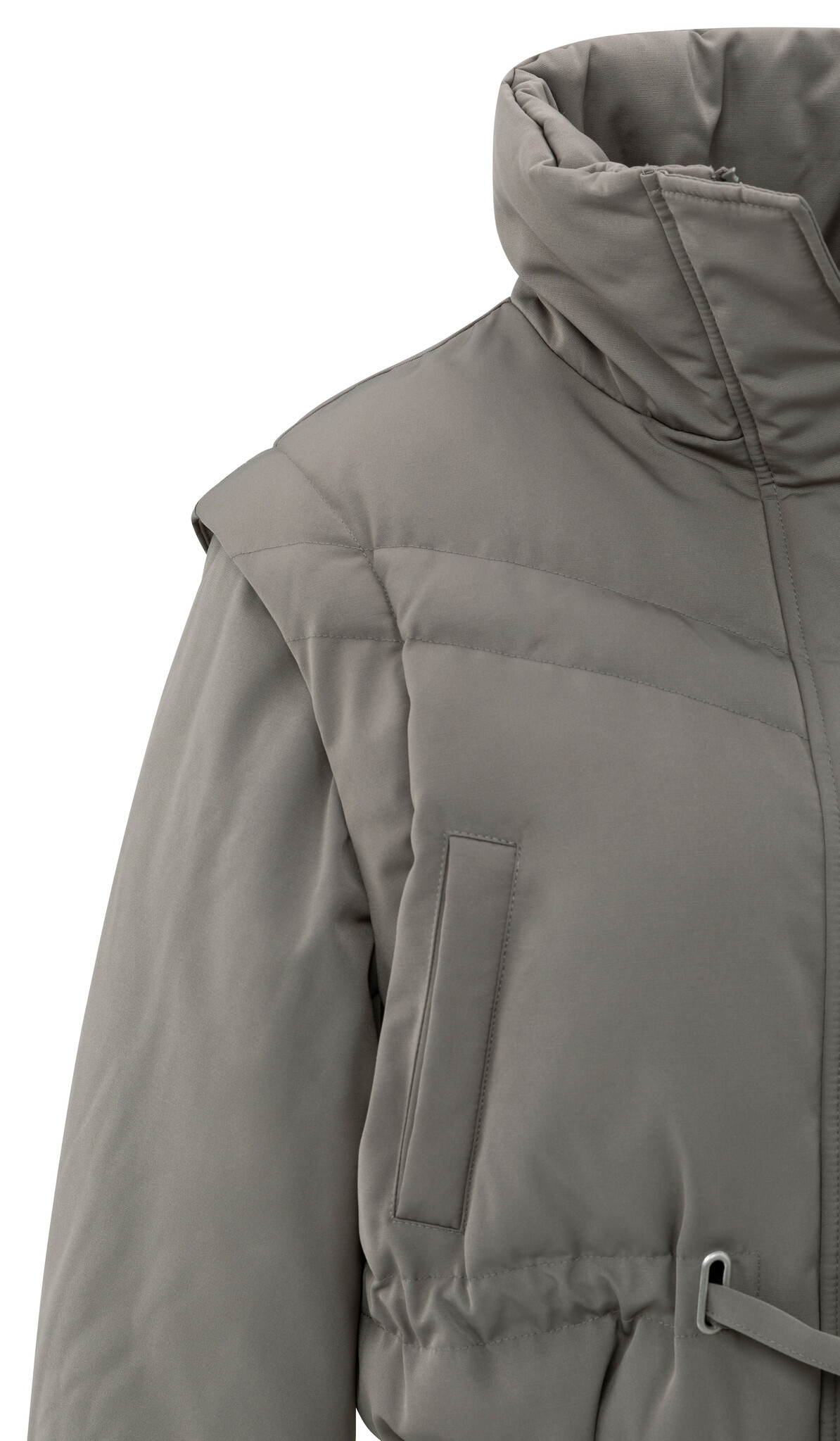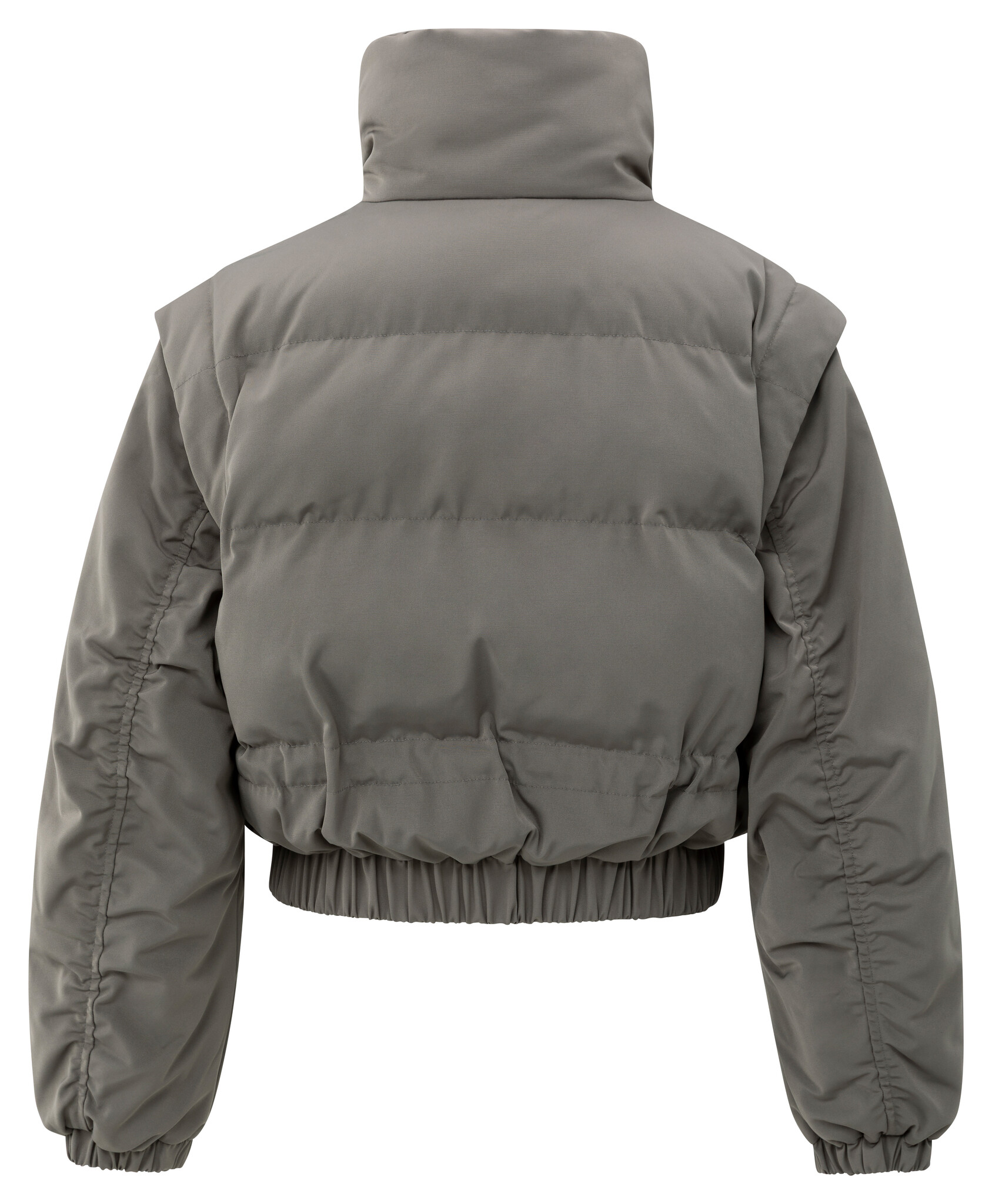 Deze gewatteerde cropped jas is gemaakt van een nylonstof en heeft een oversized pasvorm. De jas is voorzien van een hoge kraag, ritssluiting, steekzakken en elastische boorden. Dankzij de afritsbare mouwen draag je dit item ook als een stijlvolle bodywarmer. Een veelzijdige tussenjas met een eigentijdse uitstraling.