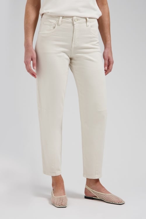 Ontdek de Tess: een barrel fit jeans met een mid-waist taille. Deze modieuze jeans heeft een subtiele ballonvorm: wijder bij de bovenbenen en taps toelopend naar de enkels. Het speelse stiksel op kniehoogte geeft de broek een uniek en eigentijds detail.