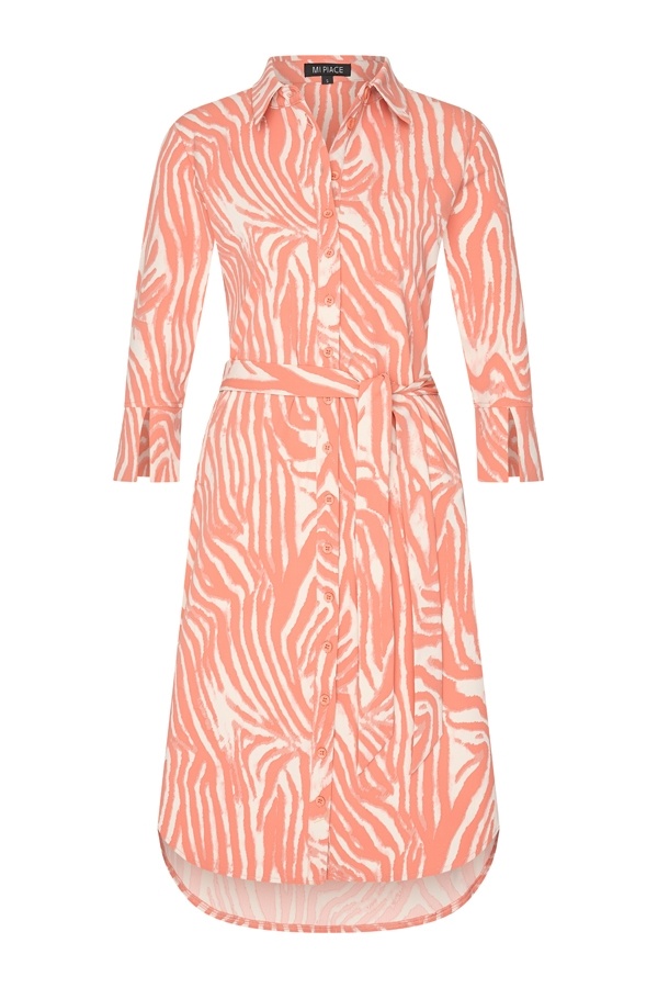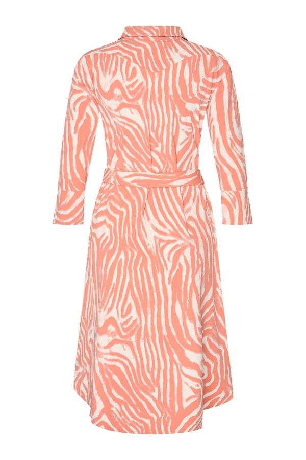 De jurk is uitgevoerd in een vrouwelijk doorknoopmodel met een kraag en driekwart mouwen, en is voorzien van een bijpassende ceintuur om je taille elegant te accentueren. De moderne print geeft deze klassieker een frisse en levendige uitstraling.