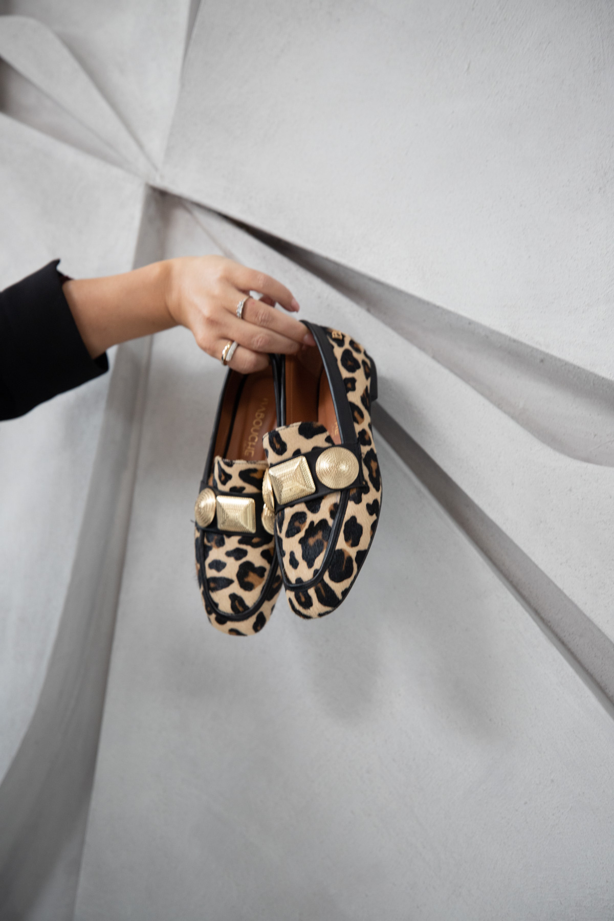 Deze opvallende leopard instappers zijn gemaakt van hoogwaardig leer en vormen de perfecte mix van lef en luxe. De speelse panterprint krijgt een stijlvolle upgrade door drie grotere gouden details op de bovenkant, echte eyecatchers die elke outfit nét dat beetje extra geven.