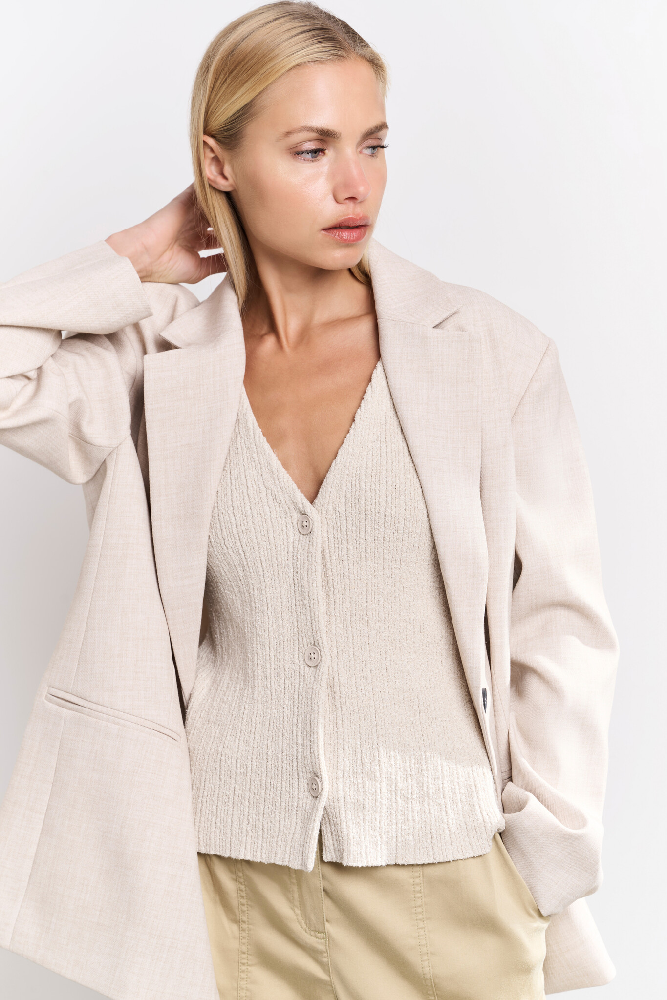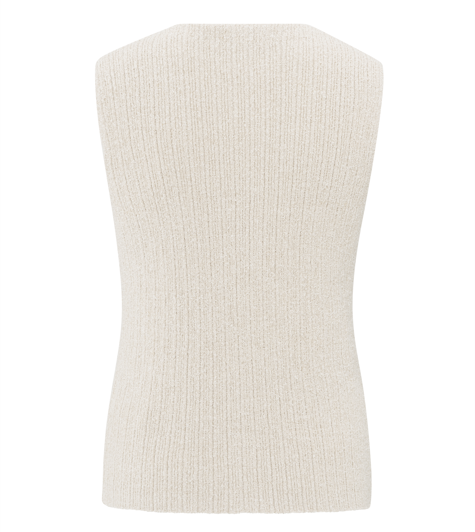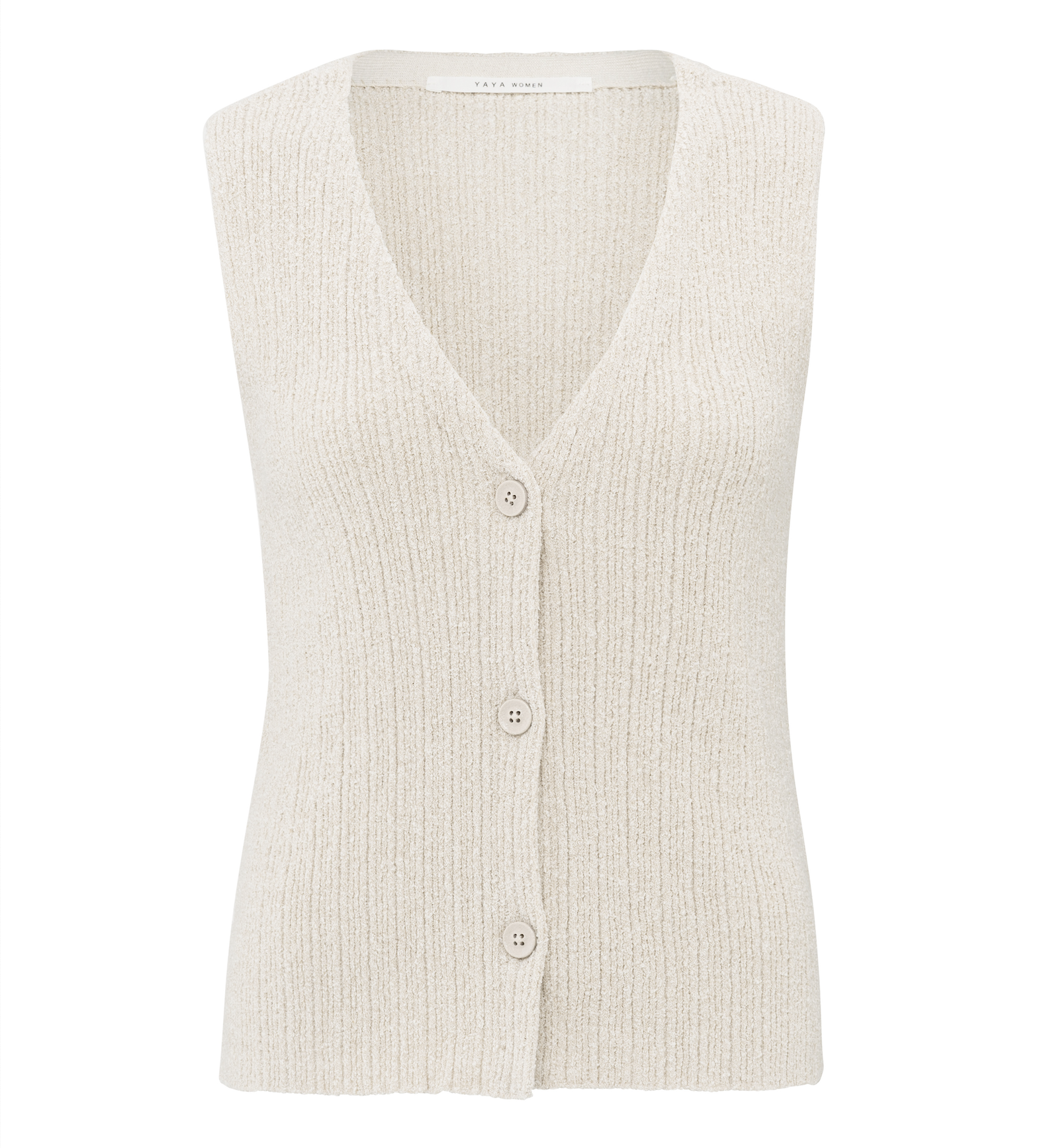 Dit stijlvolle gilet is gemaakt van een zachte, gebreide ribstof en ontworpen met een V-hals, aansluitende pasvorm en knoopsluiting aan de voorkant. De mouwloze pasvorm maakt het een veelzijdig item dat perfect is voor het voorjaar. Combineer het met een blouse of draag het solo voor een moderne en casual look.