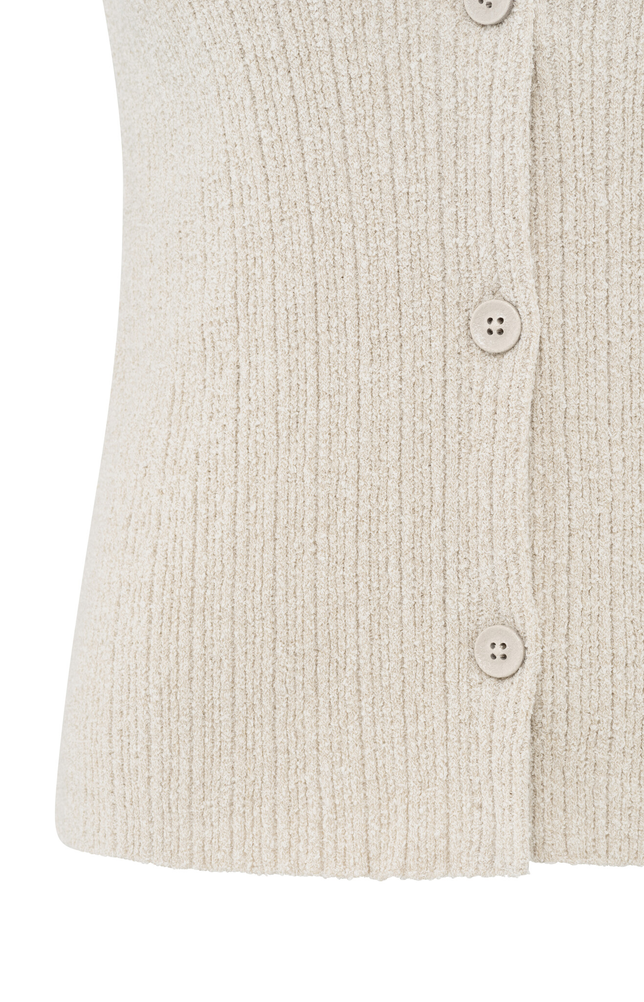 Dit stijlvolle gilet is gemaakt van een zachte, gebreide ribstof en ontworpen met een V-hals, aansluitende pasvorm en knoopsluiting aan de voorkant. De mouwloze pasvorm maakt het een veelzijdig item dat perfect is voor het voorjaar.