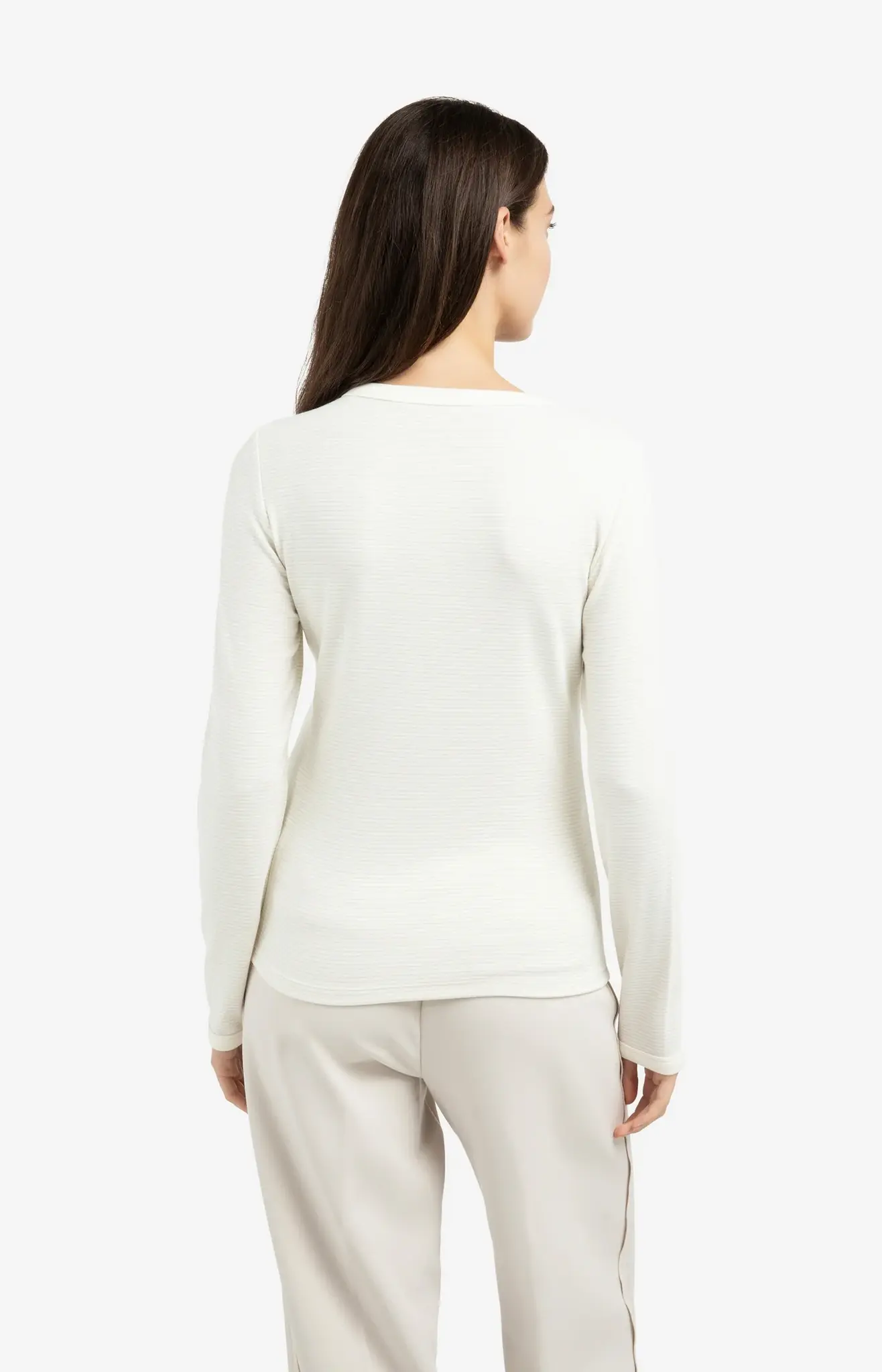 Deze comfortabele top heeft een subtiele horizontale streepstructuur en is voorzien van lange mouwen en een ronde hals. De aangesloten pasvorm en de middennaad voor en achter geven een verfijnde, moderne uitstraling.