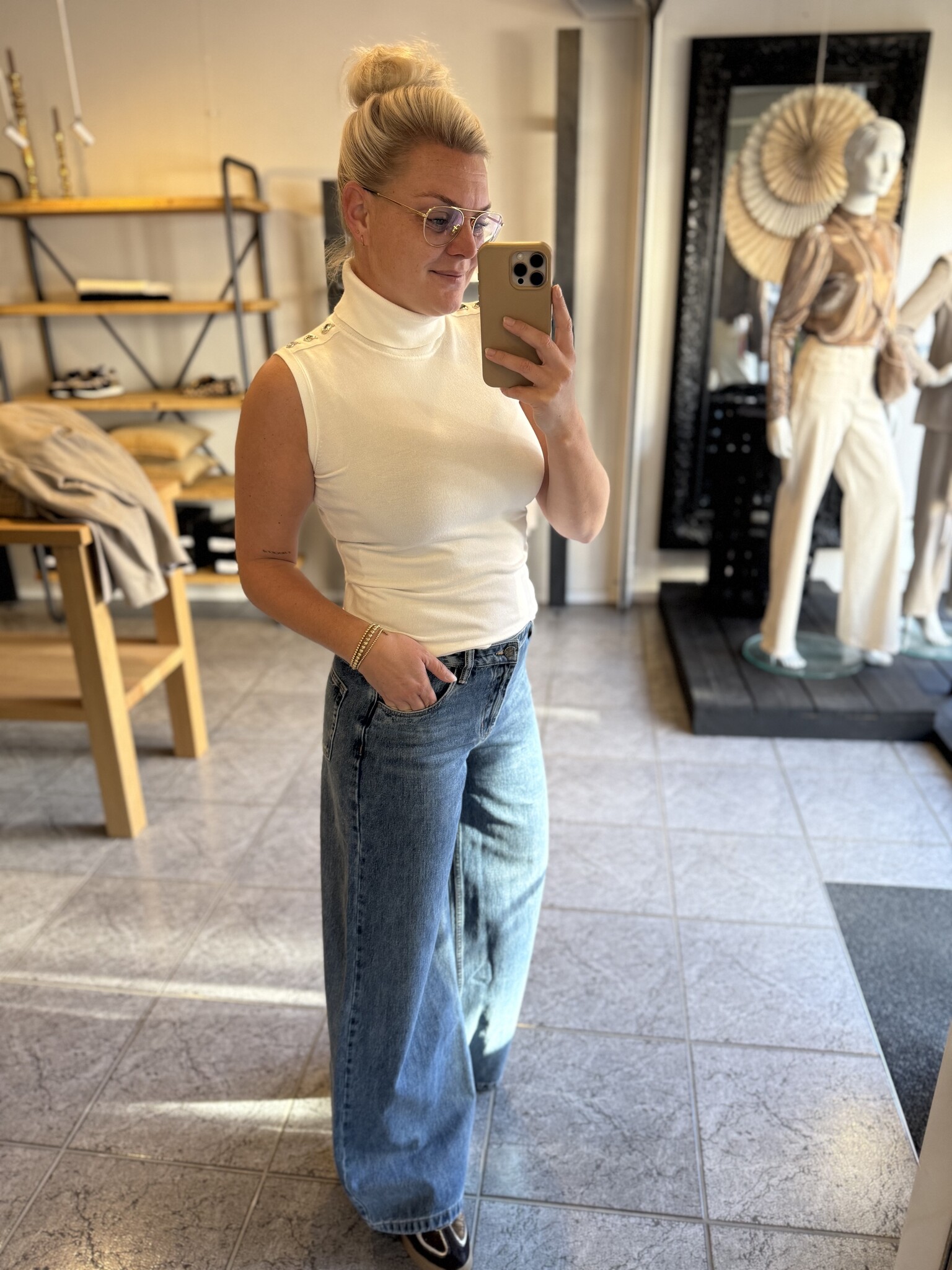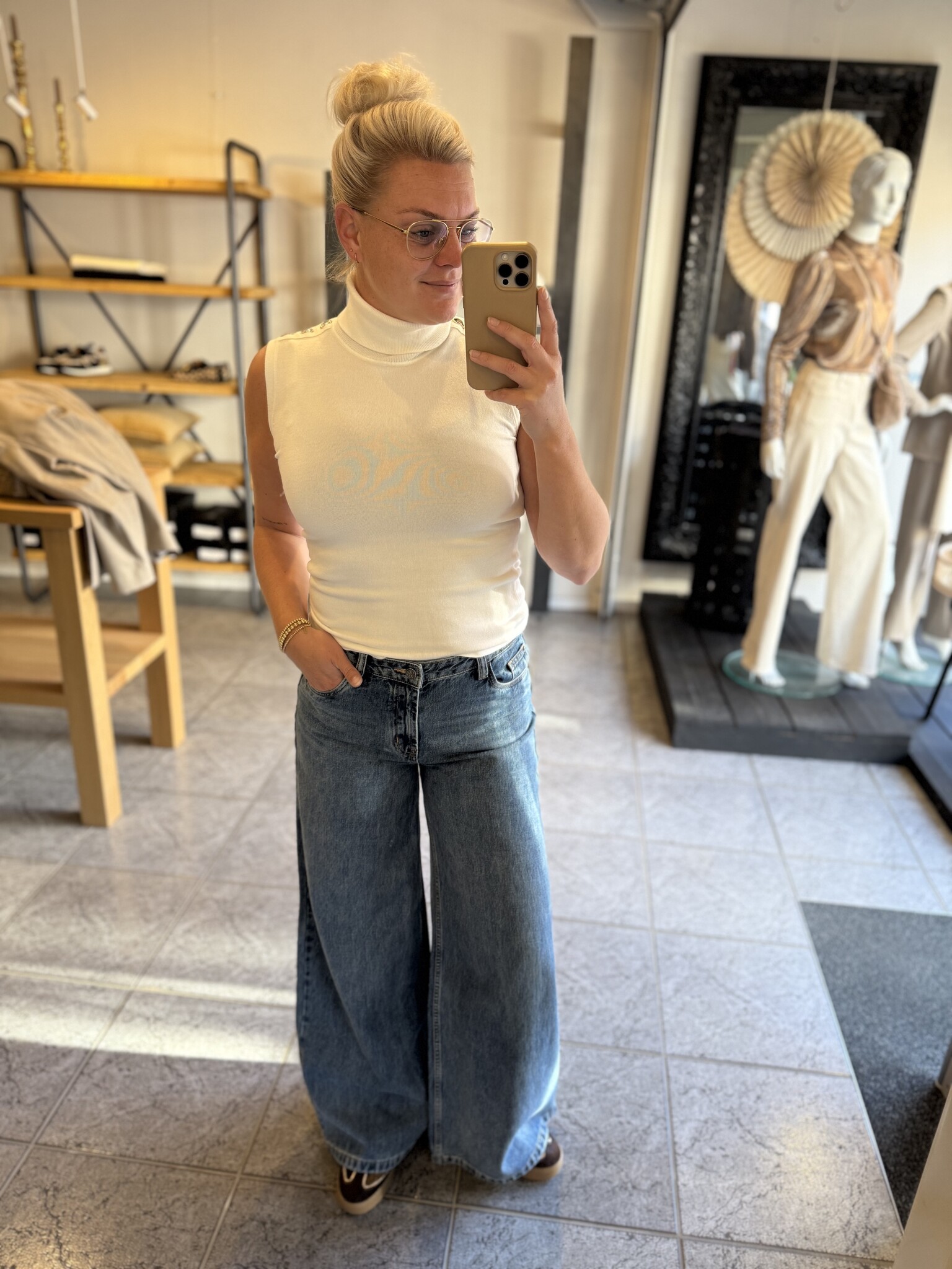 Mouwloze fijnbrei top met col en gave organisch gevormde knopen. Deze top staat prachtig onder een blazer van dezelfde kleur.