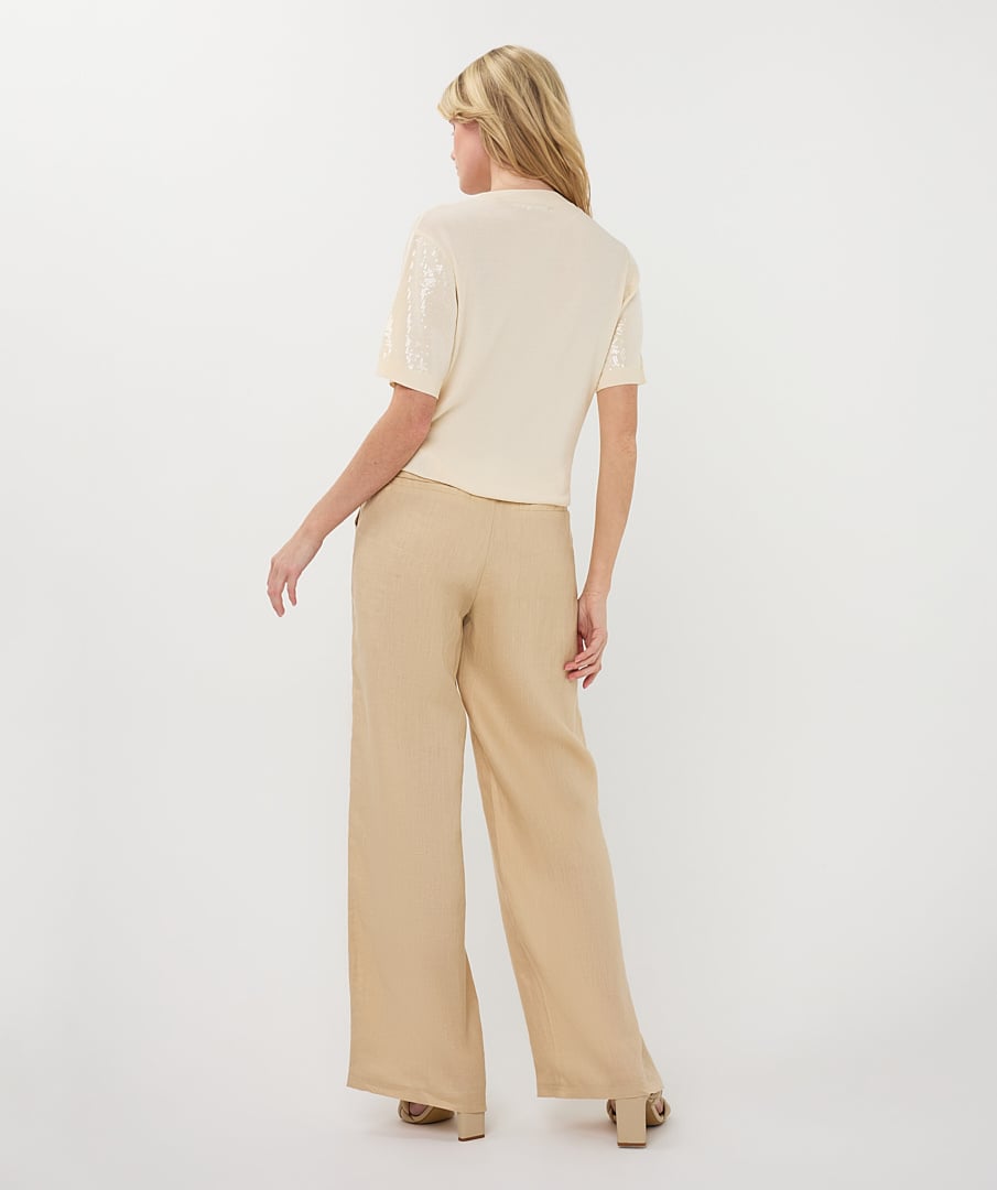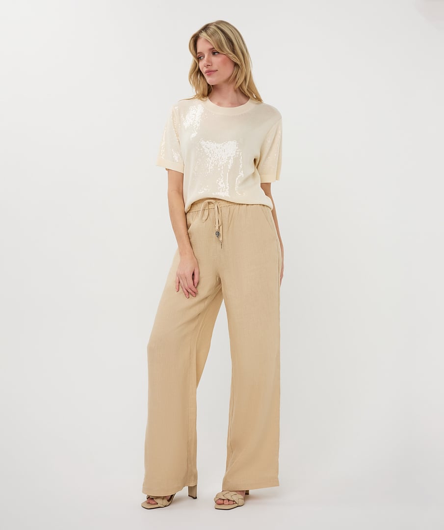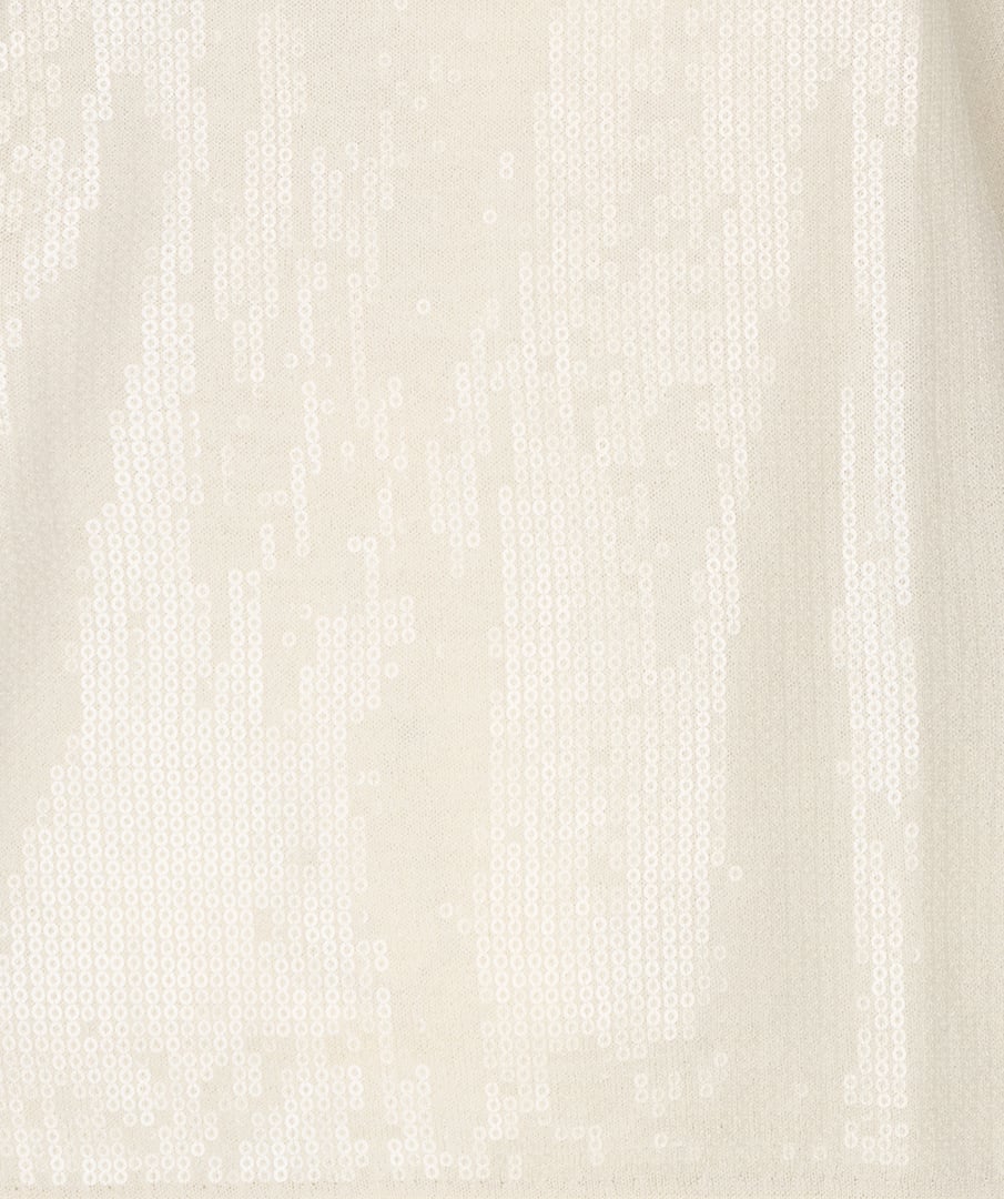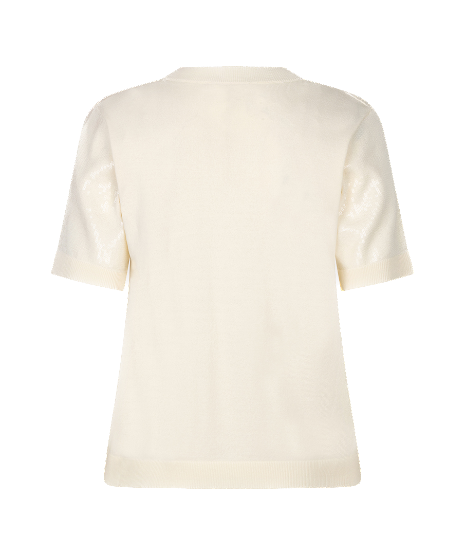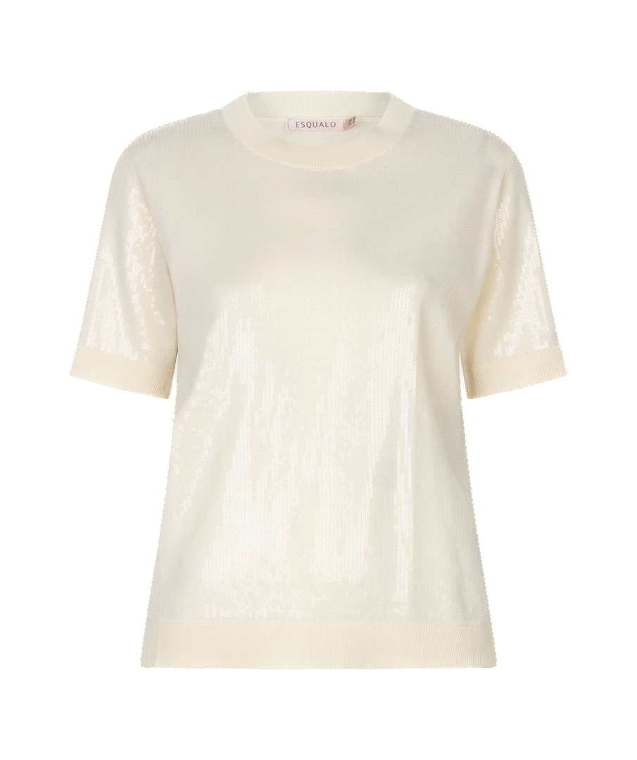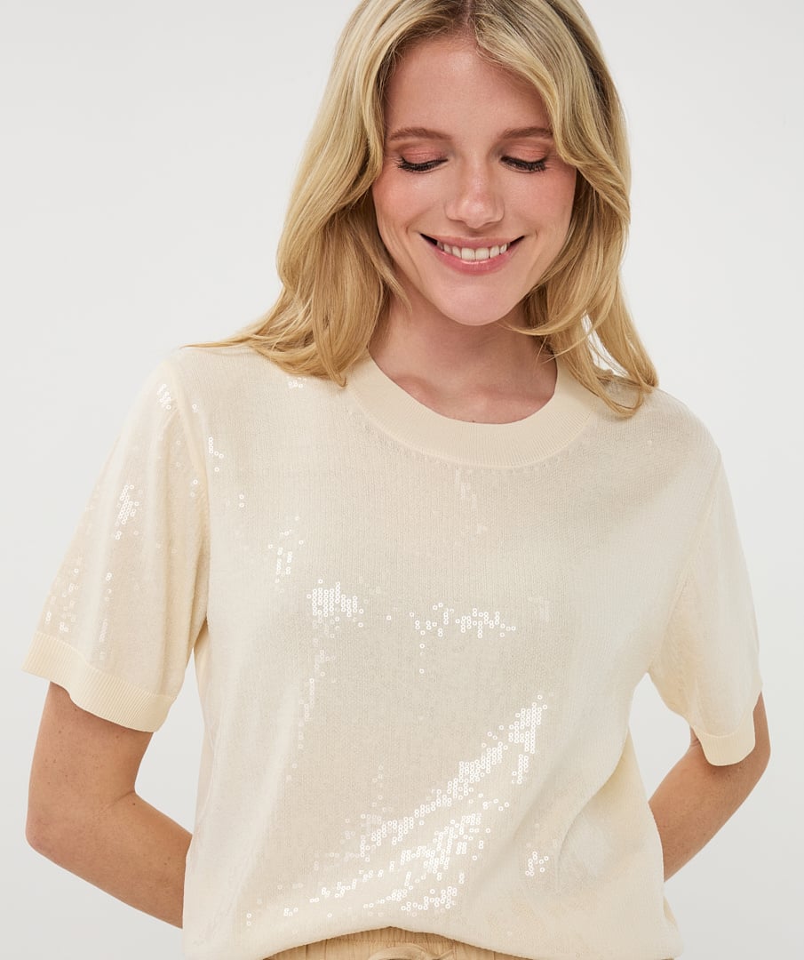 Deze fijngebreide top met korte mouwen heeft een elegante, subtiele uitstraling dankzij de kleine, doorzichtige pailletten die zorgen voor een zacht glinsterend effect.