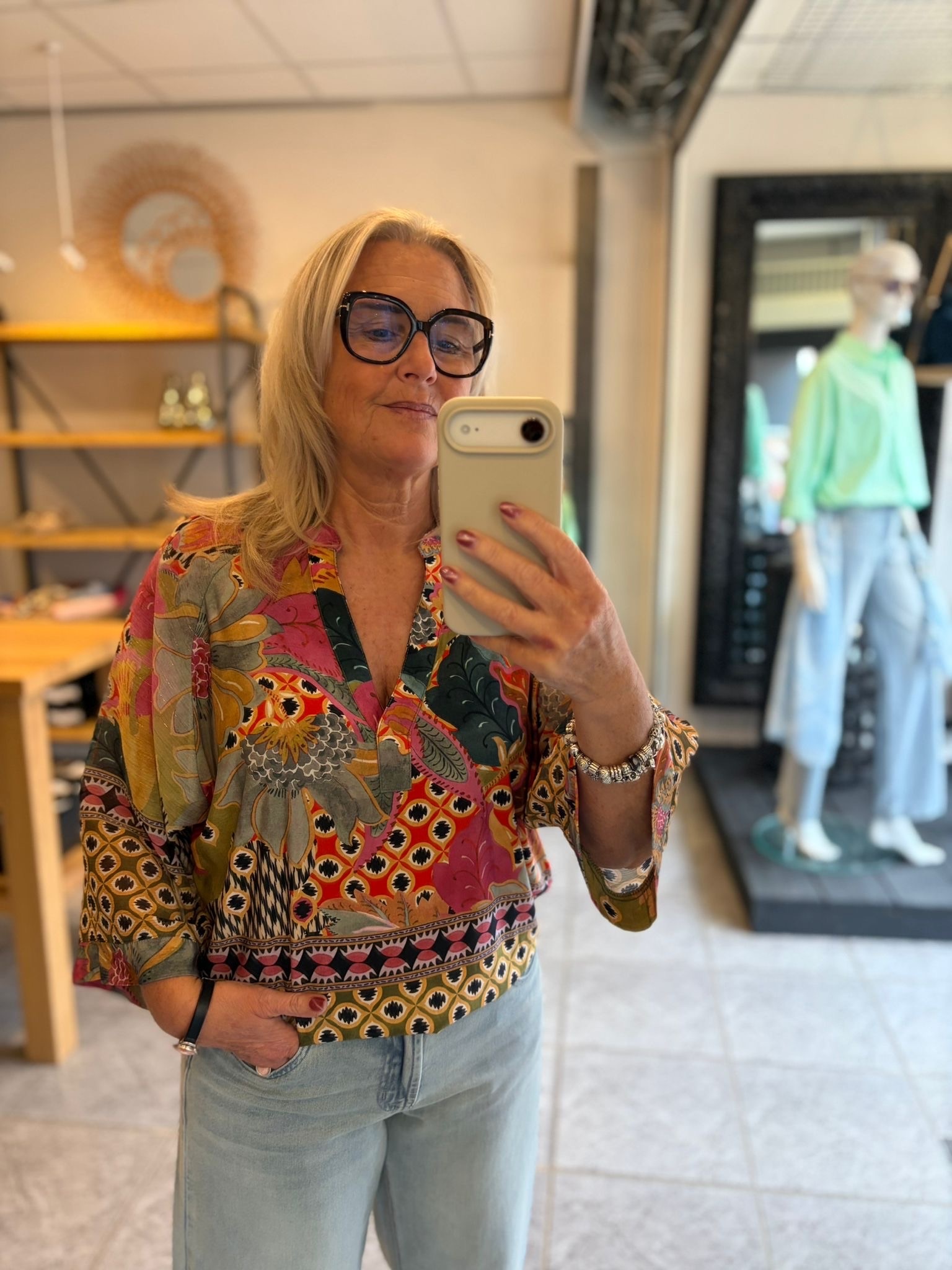 De Sara Primavera top is een ode aan het voorjaar fris, vrouwelijk en vol verfijnde details. De subtiele glans en het verfijnde dessin geven de top een luxe uitstraling, terwijl de vrouwelijke snit zorgt voor een flatterend silhouet. De halslijn is elegant afgewerkt en de mouwen vallen luchtig langs de armen, wat zorgt voor een comfortabele én stijlvolle look.