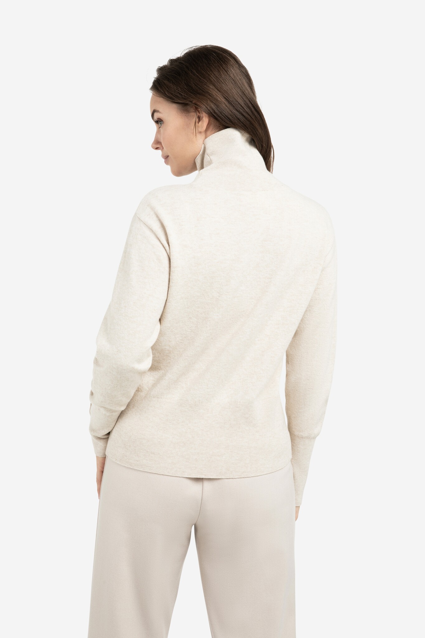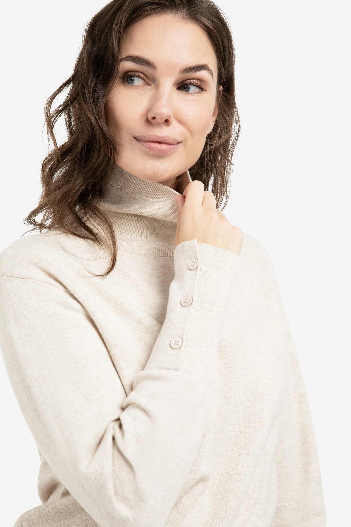 Deze elegante gebreide trui is ontworpen met een hoge col, een losse pasvorm, lange mouwen en een aangesloten tailleboord. De knoopdetails op de tailleboord en manchetten geven een subtiel speels accent aan het ontwerp.
