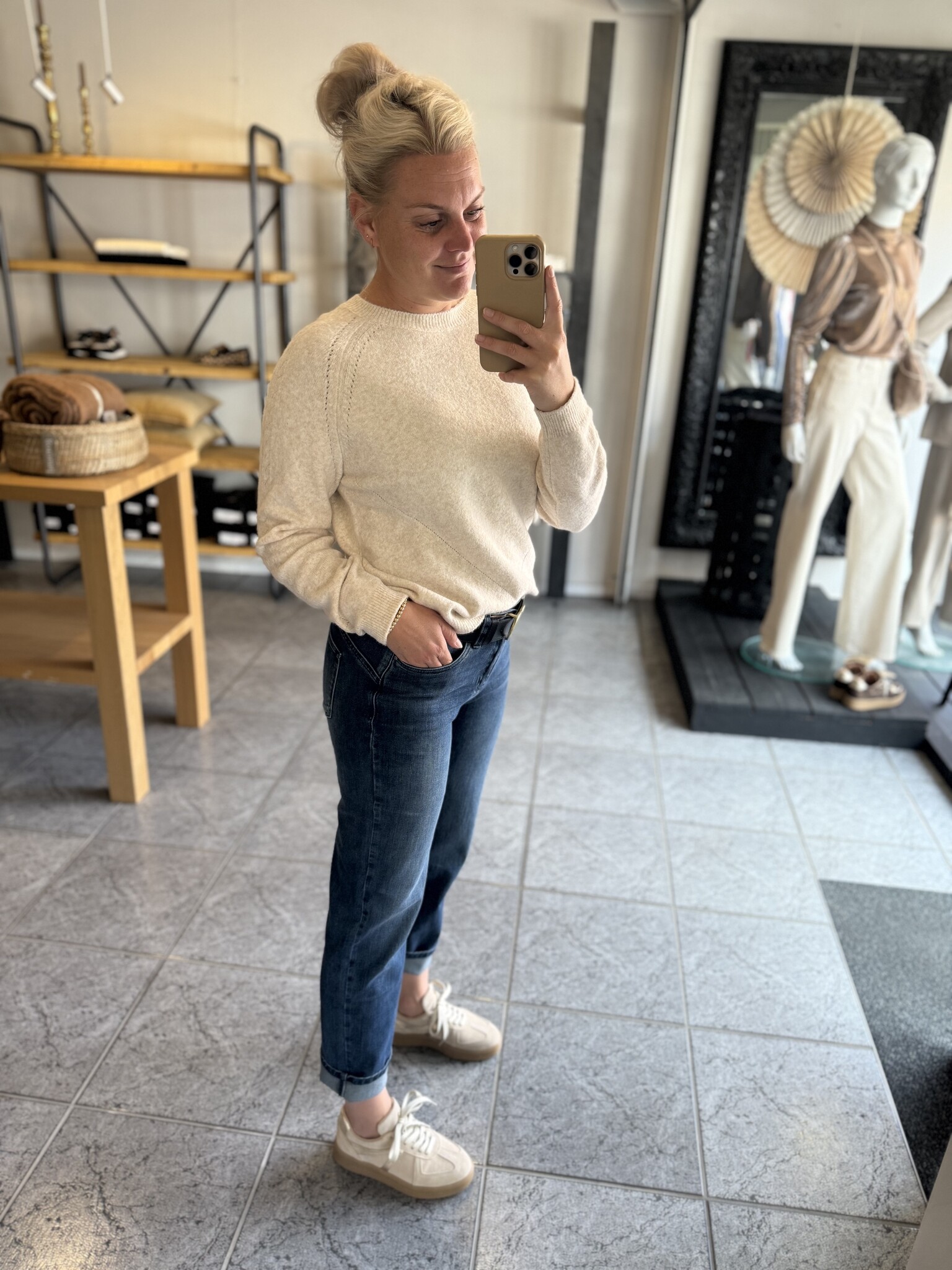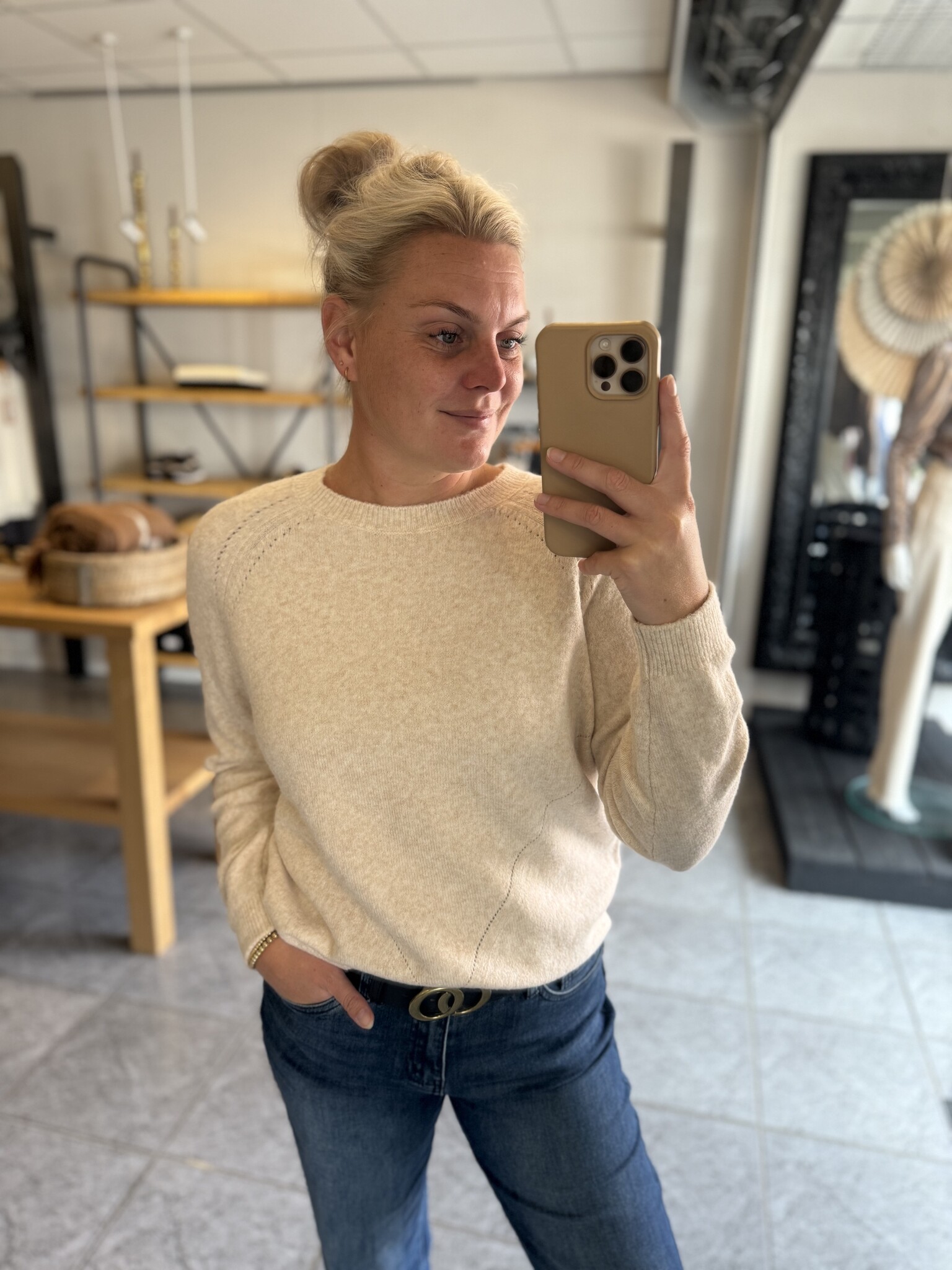 Melange trui met v patroon en ajour zig zag op de mouwen.