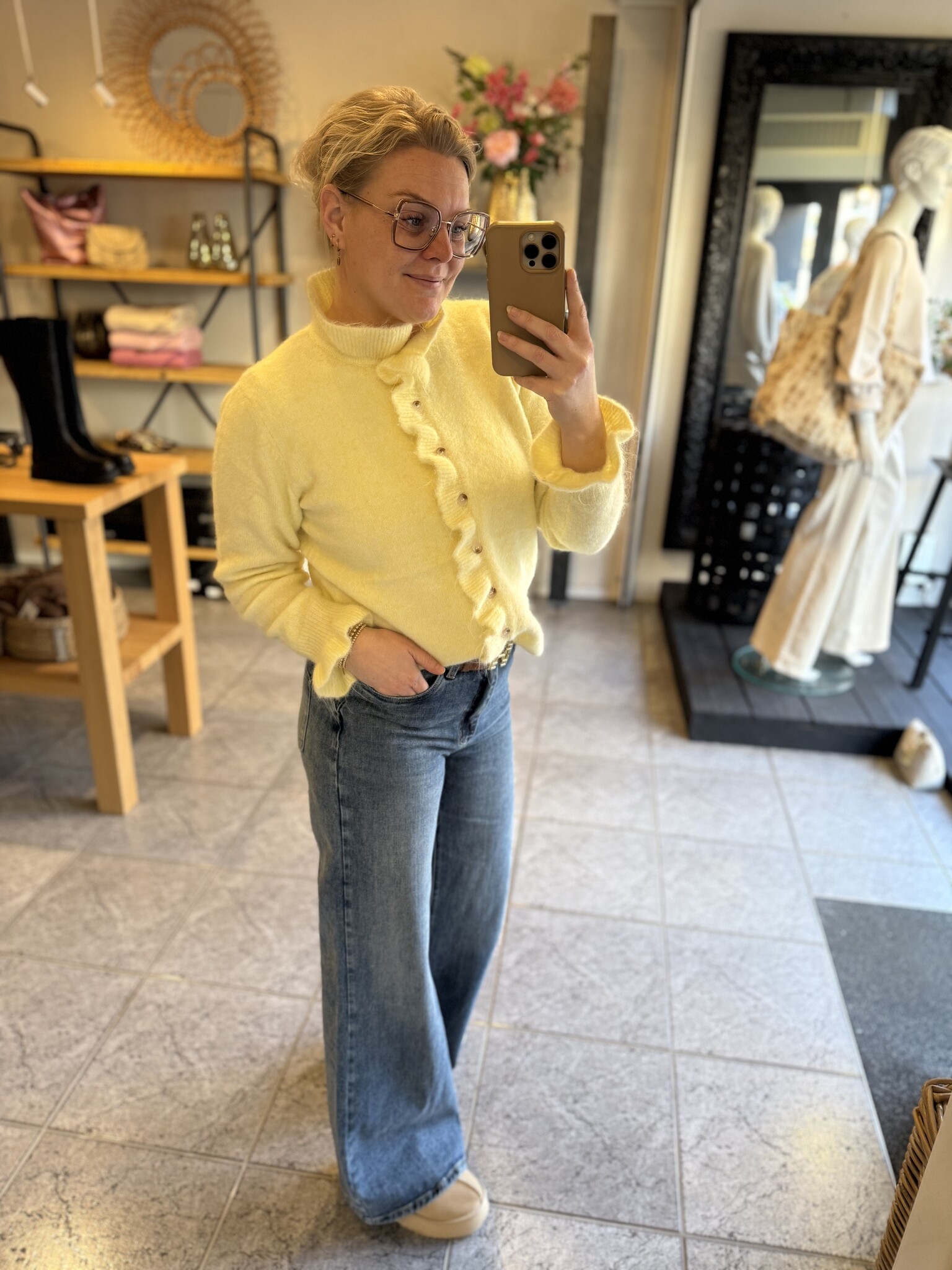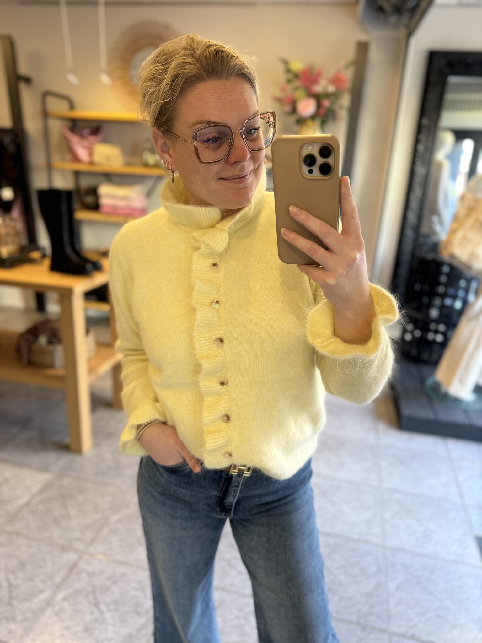 Dit prachtige zachte vest in een frisse pastelgele tint is een echte blikvanger voor elk seizoen. Het model heeft een elegante opstaande kraag en subtiele ruffle details langs de knoopsluiting en manchetten, wat zorgt voor een vrouwelijke uitstraling.