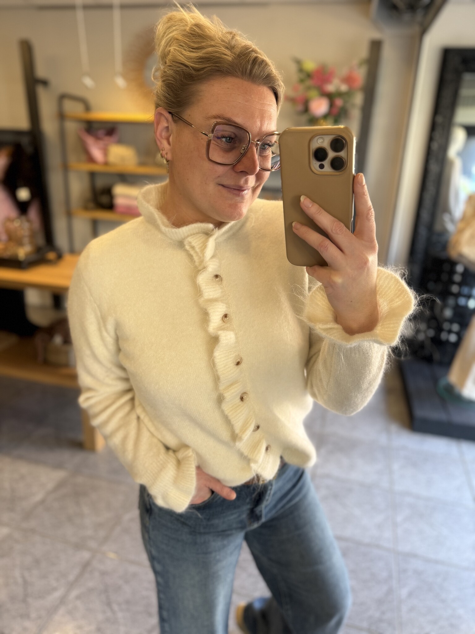 Dit prachtige zachte vest in een frisse pastelgele tint is een echte blikvanger voor elk seizoen. Het model heeft een elegante opstaande kraag en subtiele ruffle details langs de knoopsluiting en manchetten, wat zorgt voor een vrouwelijke uitstraling.